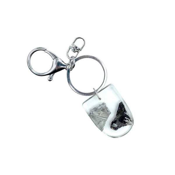 Fragment letounu je zachycen v průhledné epoxidové pryskyřici, která umožňuje detailní prozkoumání jeho povrchu a struktury. Každý šrám a každá stopa opotřebení na něm vypráví svůj vlastní příběh. Přívěsek na klíče a karabina dodávají praktičnost a umožňují nošení tohoto artefaktu jako symbolu odvahy a historie.